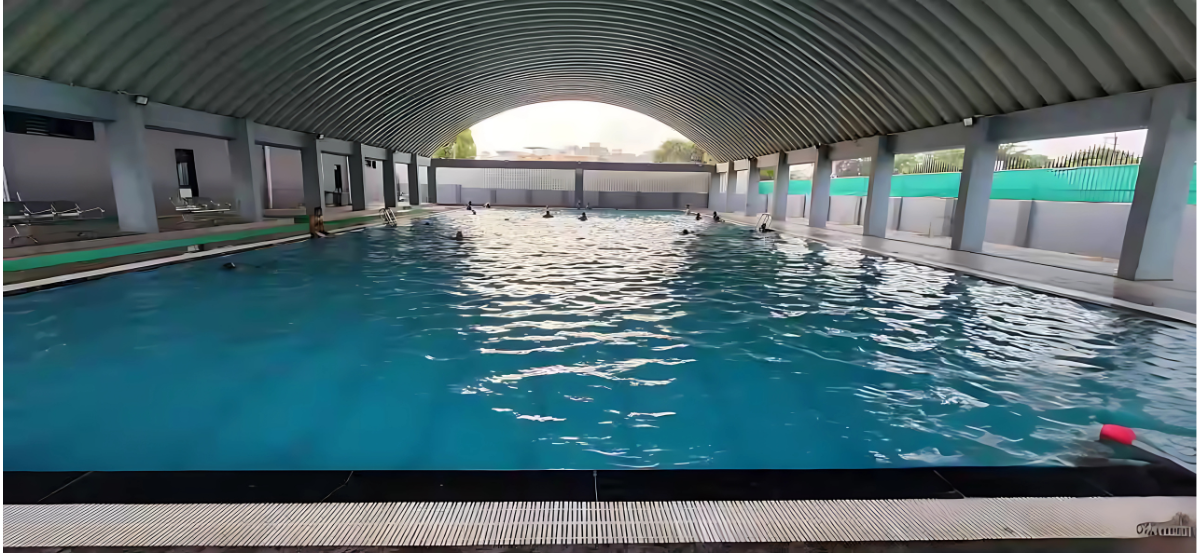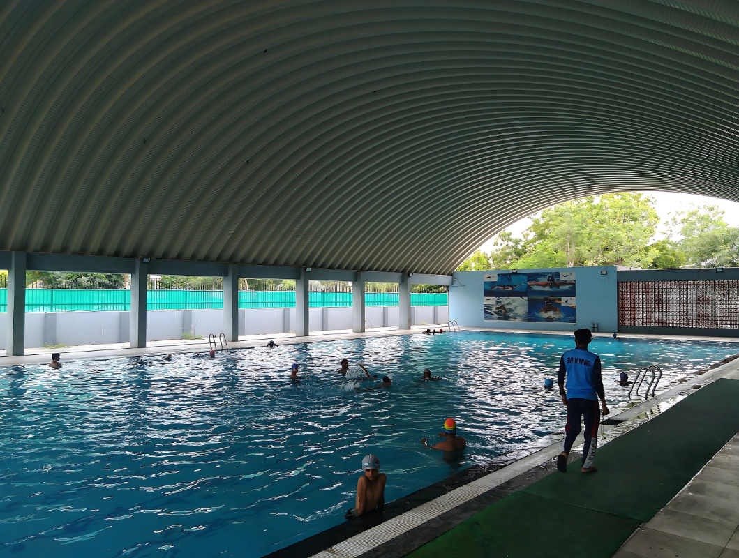 35m × 15m pool with 7ft depth, separate lanes for all levels, poolside showers, lifeguards, and training programs.Multipurpose Sports Halls